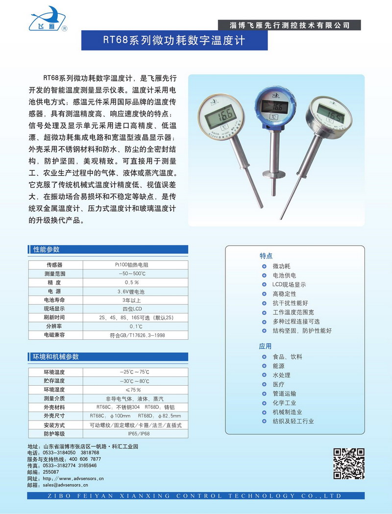 RT68系列微功耗數(shù)字溫度計,是飛雁先行開發(fā)的智能溫度測量顯示儀表。溫度計采用電池供電方式,感溫元件采用國際品牌的溫度傳感器,具有測溫精度高、響應(yīng)速度快的特點;信號處理及顯示單元采用進口高精度、低溫漂、超微功耗集成電路和寬溫型液晶顯示器;外殼采用不銹鋼材料和防水、防塵的全密封結(jié)構(gòu),防護堅固,美觀精致。可直接用于測量工、農(nóng)業(yè)生產(chǎn)過程中的氣體、液體或蒸汽溫度。它克服了傳統(tǒng)機械式溫度計精度低、視值誤差大,在振動場合易損壞和不穩(wěn)定等缺點,是傳統(tǒng)雙金屬溫度計、壓力式溫度計和玻璃溫度計的升級換代產(chǎn)品。