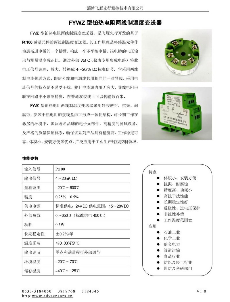 FYWZ 型鉑熱電阻兩線制溫度變送器采用硅膠密封,抗振、耐腐蝕,安裝于熱電阻的接線盒內(nèi)可形成一體化結(jié)構(gòu),可長期工作在惡劣的環(huán)境中,國際著名品牌的電子元部件、高精度的測試設(shè)備、及嚴格的質(zhì)量保證體系,確保該系列產(chǎn)品具有精度高、工作穩(wěn)定可靠、體積小、安裝方便等優(yōu)點,廣泛應(yīng)用于工業(yè)生產(chǎn)過程控制領(lǐng)域。