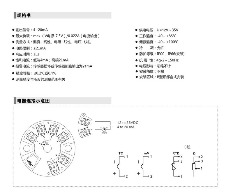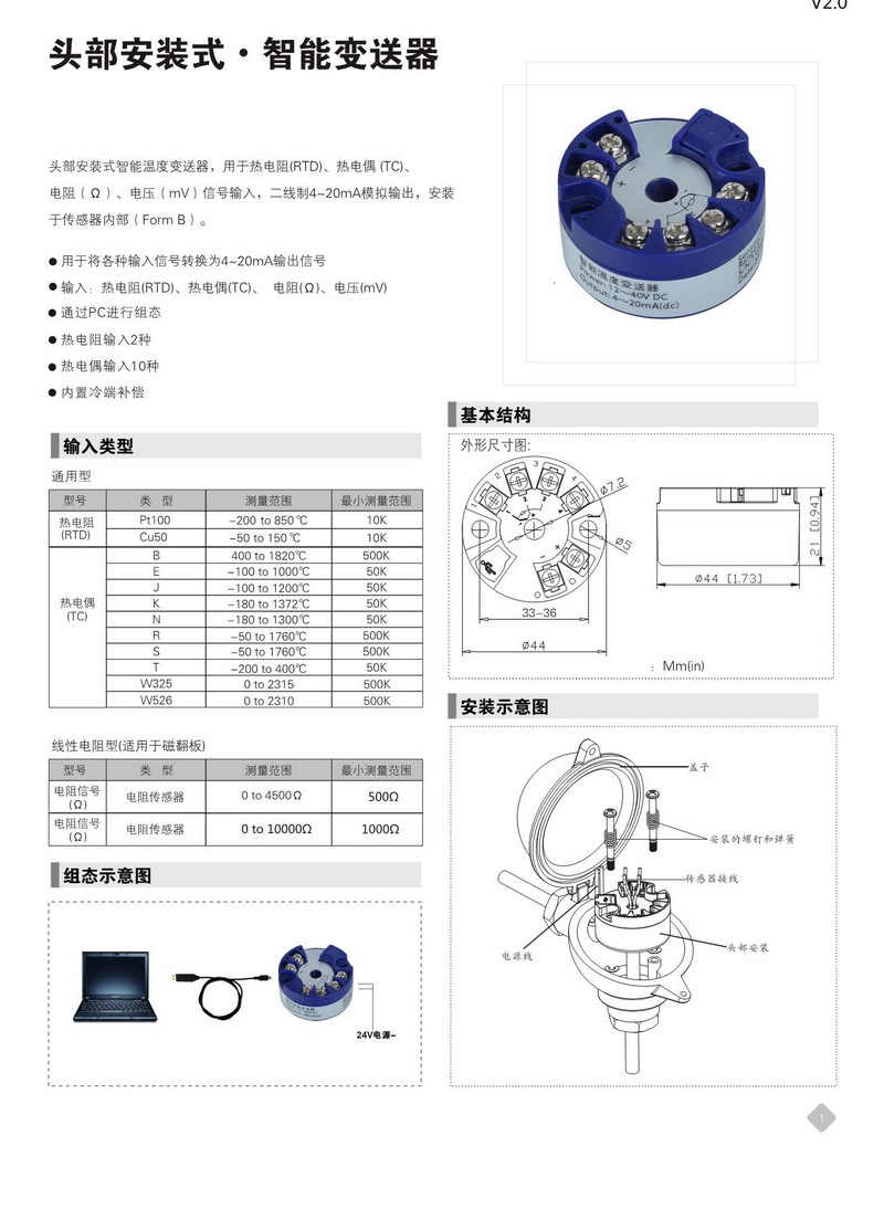 頭部安裝式智能溫度變送器, 用于熱電阻(RTD) 、熱電鍋(TC )、電阻(Q)、電壓(mV)信號輸入,二線制4-20mA模擬輸出,安裝于傳感器內(nèi)部(Fom mB)