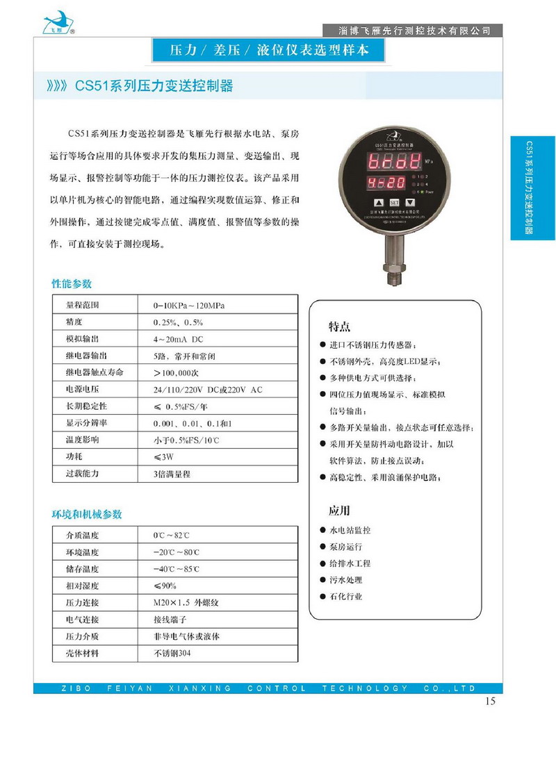CS51系列壓力變送控制器是飛框先行根據(jù)水電站、泵房運(yùn)行等場合應(yīng)用的具體要求開發(fā)的集壓力測量、變送輸出、現(xiàn)場顯示、報警控制等功能于一體的壓力測控儀表。該產(chǎn)品采用以單片機(jī)為核心的智能電路,通過編程實(shí)現(xiàn)數(shù)值運(yùn)算,修正和外圍操作,通過按鍵完成零點(diǎn)值,滿度值、報警值等參數(shù)的操作,可直接安裝于測控現(xiàn)場。