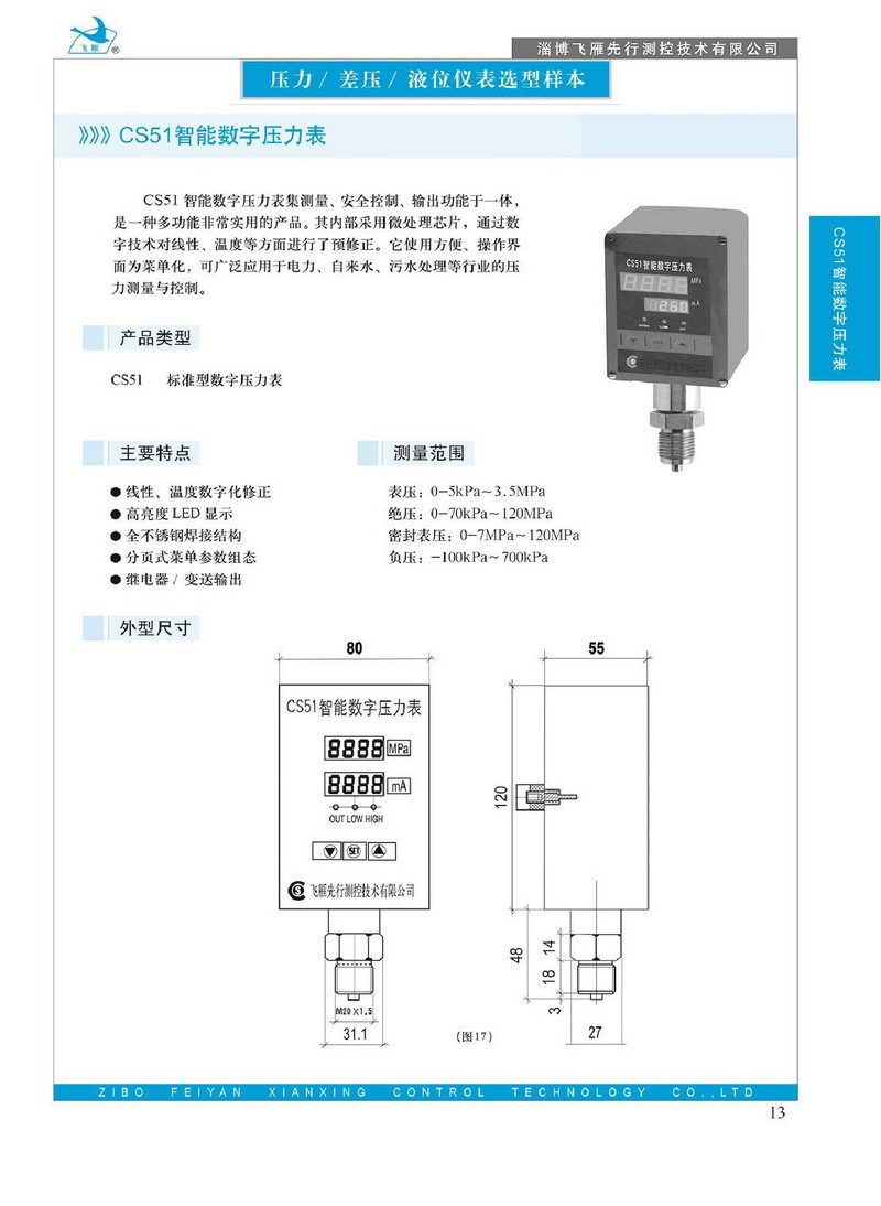 CS51智能數(shù)字壓力表集測量、安全控制、輸出功能于一體,是一種多功能非常實(shí)用的產(chǎn)品。其內(nèi)部采用微處理芯片,通過數(shù)字技術(shù)對線性,溫度等方面進(jìn)行了預(yù)修正,它使用方便,操作界面為菜單化,可廣泛應(yīng)用于電力、自來水,污水處理等行業(yè)的壓力測量與控制。
