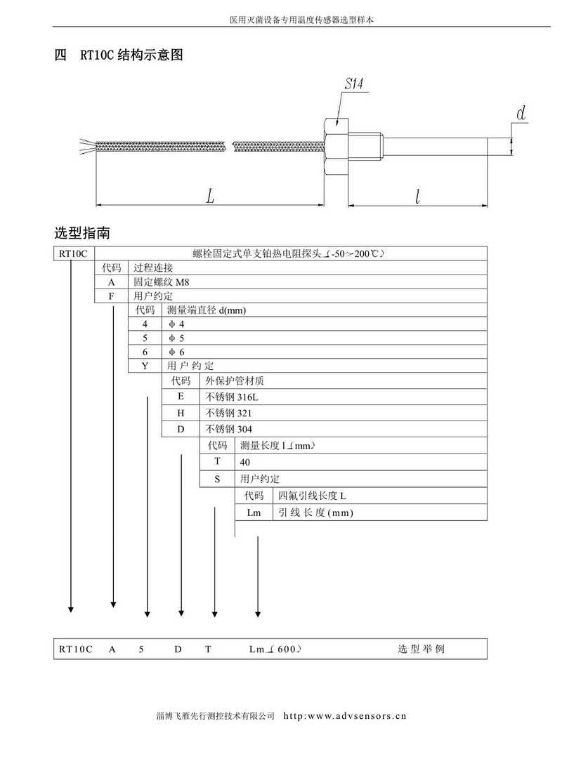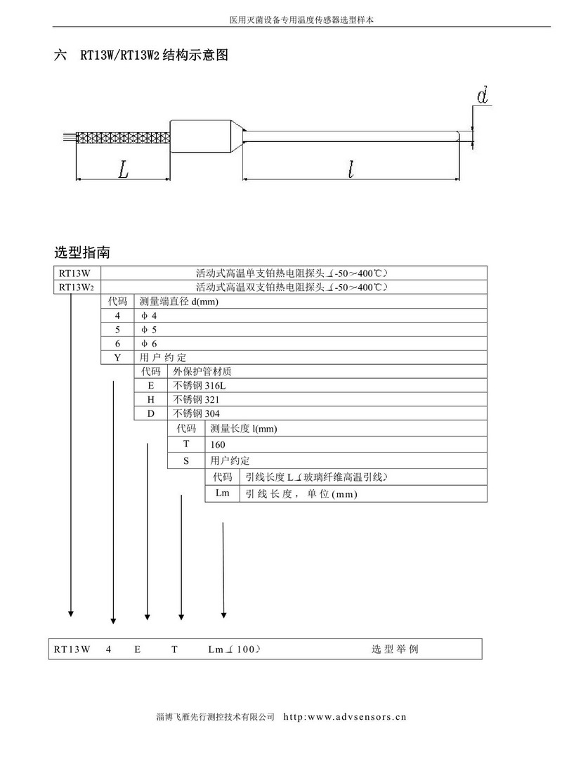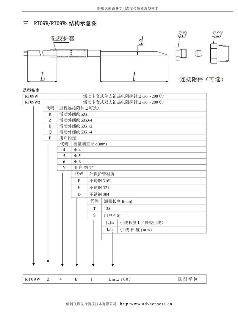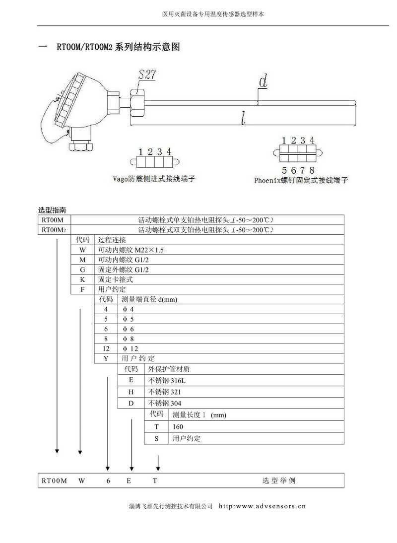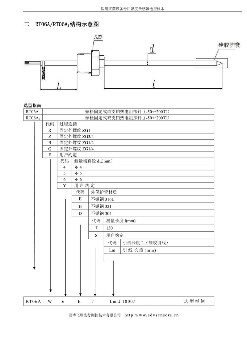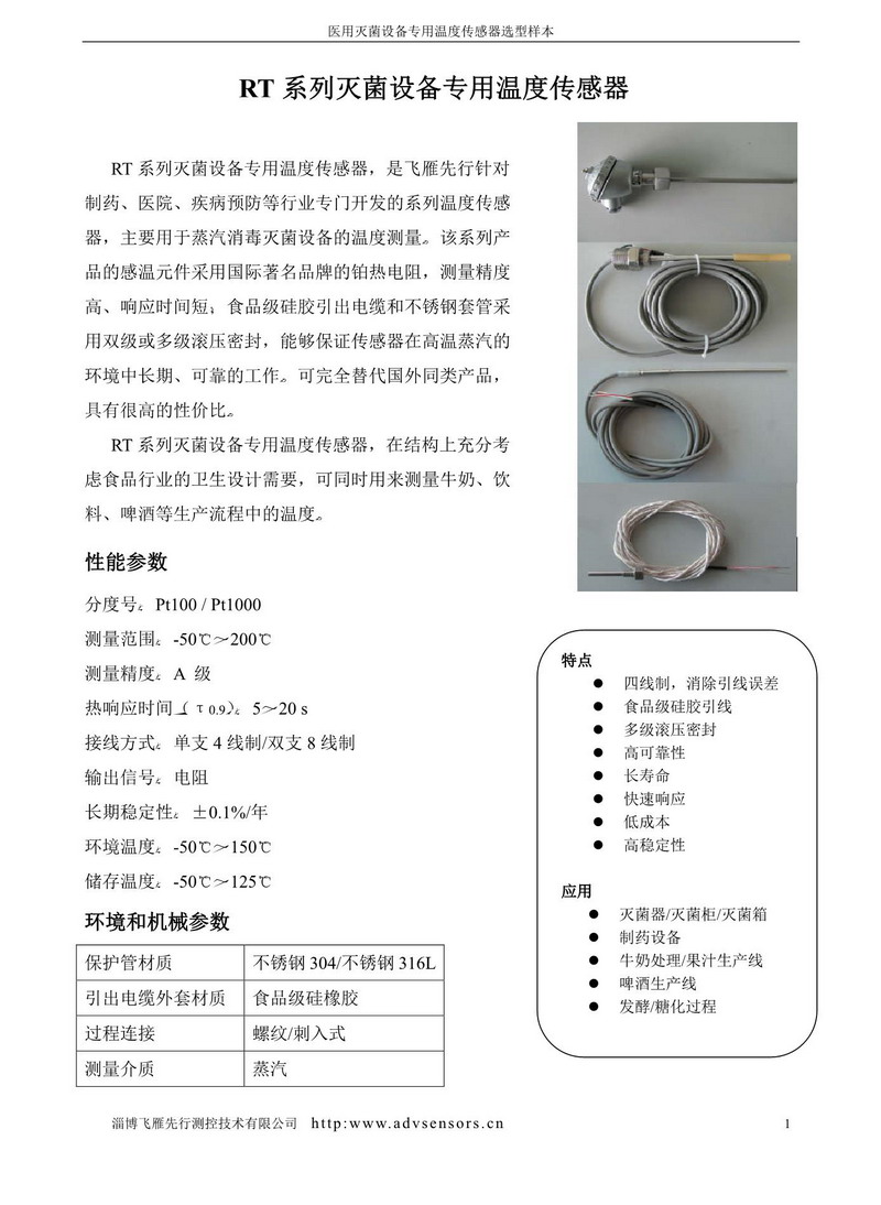 RT系列滅菌設(shè)備專用溫度傳感器,是飛雁先行針對(duì)制藥、醫(yī)院、疾病預(yù)防等行業(yè)專門開發(fā)的系列溫度傳感器,主要用于蒸汽消毒滅菌設(shè)備的溫度測(cè)量。該系列產(chǎn)品的感溫元件采用國際著名品牌的鉑熱電阻,測(cè)量精度高、響應(yīng)時(shí)間短,食品級(jí)硅膠引出電纜和不銹鋼套管采用雙級(jí)或多級(jí)滾壓密封,能夠保證傳感器在高溫蒸汽的環(huán)境中長期、可靠的工作。可完全替代國外同類產(chǎn)品,具有很高的性價(jià)比。 RT系列滅菌設(shè)備專用溫度傳感器,在結(jié)構(gòu)上充分考慮食品行業(yè)的衛(wèi)生設(shè)計(jì)需要,可同時(shí)用來測(cè)量牛奶、飲料、啤酒等生產(chǎn)流程中的溫度。