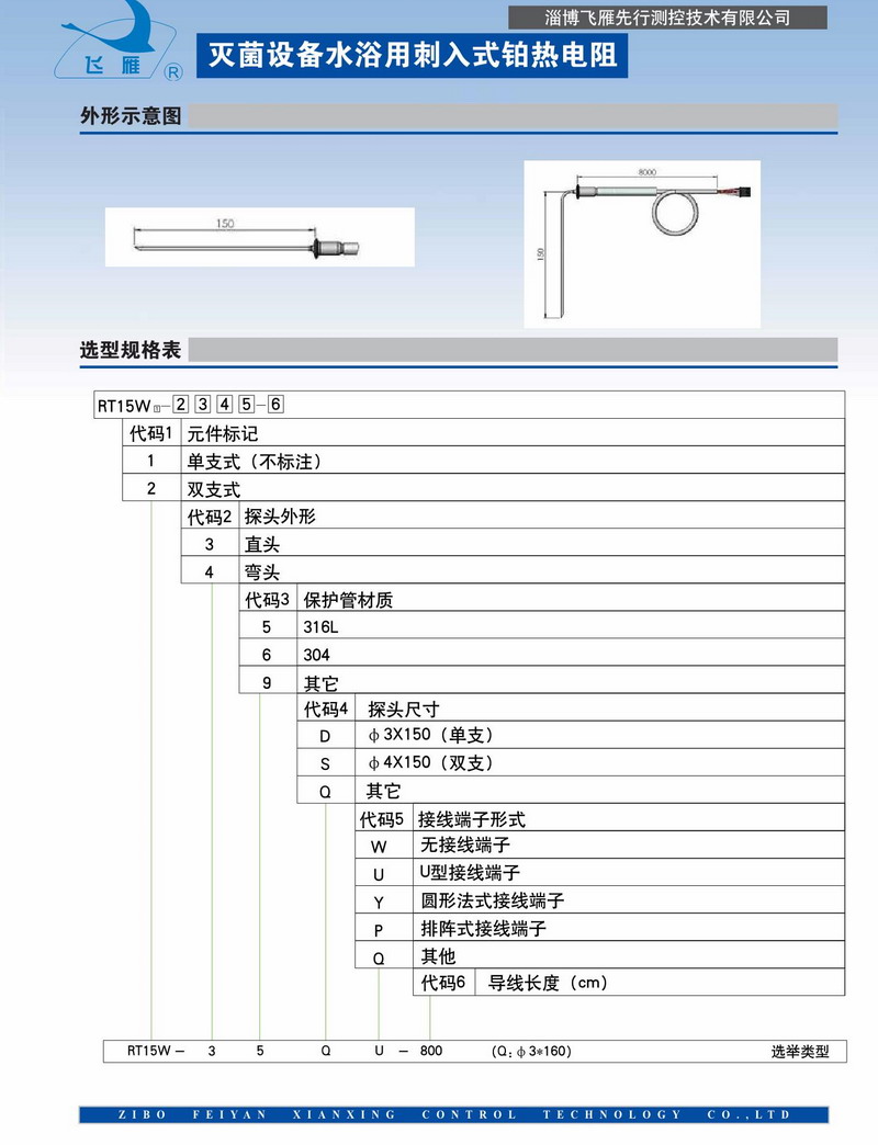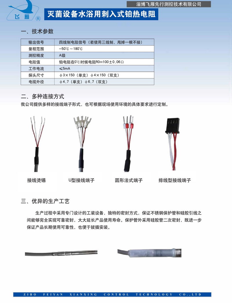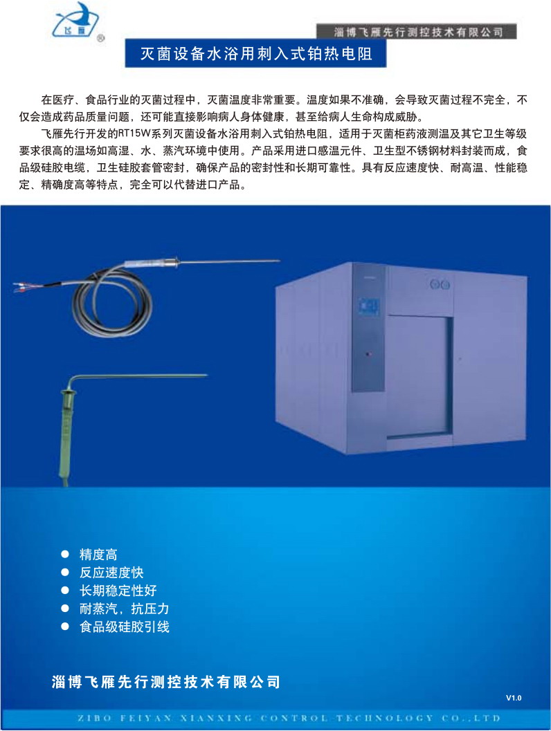 在醫(yī)療、食品行業(yè)的滅菌過程中,滅菌溫度非常重要。溫度如果不準(zhǔn)確,會導(dǎo)致滅菌過程不完全,不僅會造成藥品質(zhì)量問題,還可能直接影響病人身體健康,甚至給病人生命構(gòu)成威脅。 飛雁先行開發(fā)的RT15W系列滅菌設(shè)備水浴用刺入式鉑熱電阻,適用于滅菌柜藥液測溫及其它衛(wèi)生等級要求很高的溫場如高濕、水、蒸汽環(huán)境中使用。產(chǎn)品采用進(jìn)口感溫元件、衛(wèi)生型不銹鋼材料封裝而成,食品級硅膠電纜,衛(wèi)生硅膠套管密封,確保產(chǎn)品的密封性和長期可靠性。具有反應(yīng)速度快、耐高溫、性能穩(wěn)定、精確度高等特點,完全可以代替進(jìn)口產(chǎn)品。