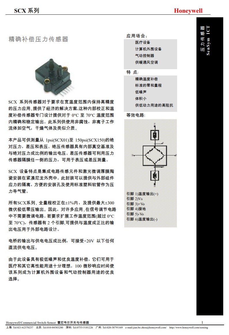 所有SCX系列, 全量程校正在±1%內(nèi), 及提供最大±300微伏極低零壓輸出。因此,對(duì)許多應(yīng)用,在信號(hào)調(diào)節(jié)電路中不需要微調(diào)電路。若要求擴(kuò)展工作溫度范圍(超過(guò)0℃至70°℃),傳感器有2個(gè)引腳,可提供與溫度成正比的輸出電壓用于外部電路設(shè)計(jì)。