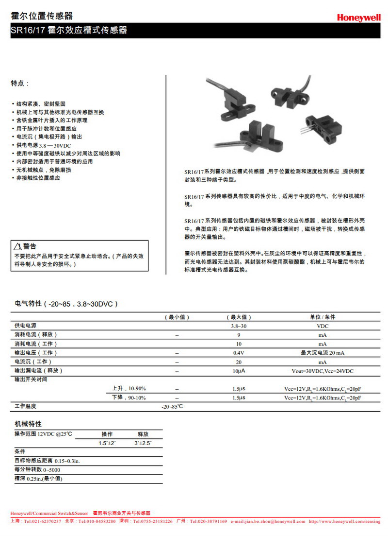 SR16/17系列霍爾效應(yīng)槽式傳感器,用于位置檢測和速度檢測感應(yīng),提供側(cè)面封裝和三種端子類型。 SR16/17系列傳感器具有較高的性價比,適用于中度的電氣、化學和機械環(huán)境。 SR16/17系列傳感器包括內(nèi)置的磁鐵和霍爾效應(yīng)傳感器,被封裝在槽形外殼中。典型應(yīng)用:用戶的鐵磁目標物體通過槽間時,磁場被干擾,轉(zhuǎn)換成傳感器的開關(guān)量輸出。 霍爾傳感器被密封在塑料外殼中。在頂塵的環(huán)境中可以保證精度和重復性,而光電傳感器無法達到。其封裝材料使用聚碳酸酯,機械上與霍尼韋爾的標準槽式光電傳感器互換。